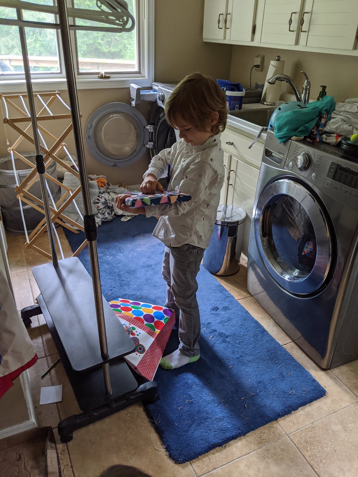 I had a lot of work to do today (online admin work for financial psychologist, VBS coordination volunteerwork, coordinating E's School Council meeting and following up on a few items from the last meeting) and I also attended an hour long parenting Zoom call about PLAY put on by a local child psychologist. So not a lot of photos today, and lots of independent play for both boys. E really enjoyed playing with our electric keyboard today and T listened to a ton of books on CD.